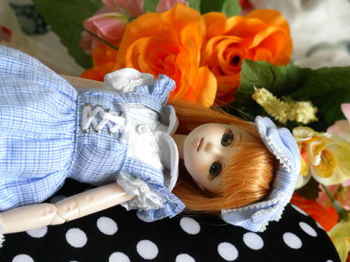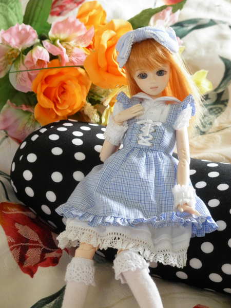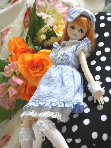 服はアゾンインターネットのサックス色フリルスカートです。